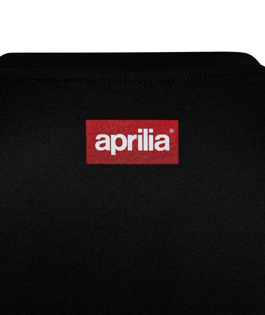 Encolure ronde. Manches courtes. Bordure de col côtelée. Bandeau de cou renforcé en coton. Logo Aprilia imprimé sur le devant. Logo Aprilia imprimé à l'arrière. Application sur la manche avec patch en PVC souple. Etiquette en tissu brodée avec le logo Aprilia.